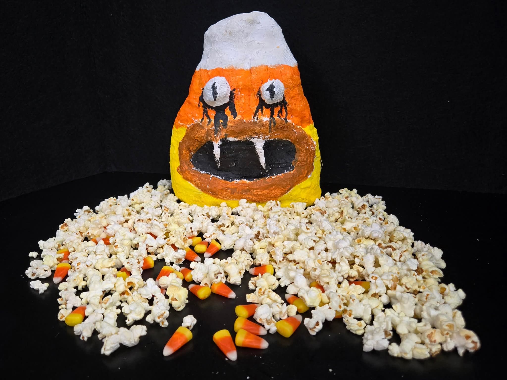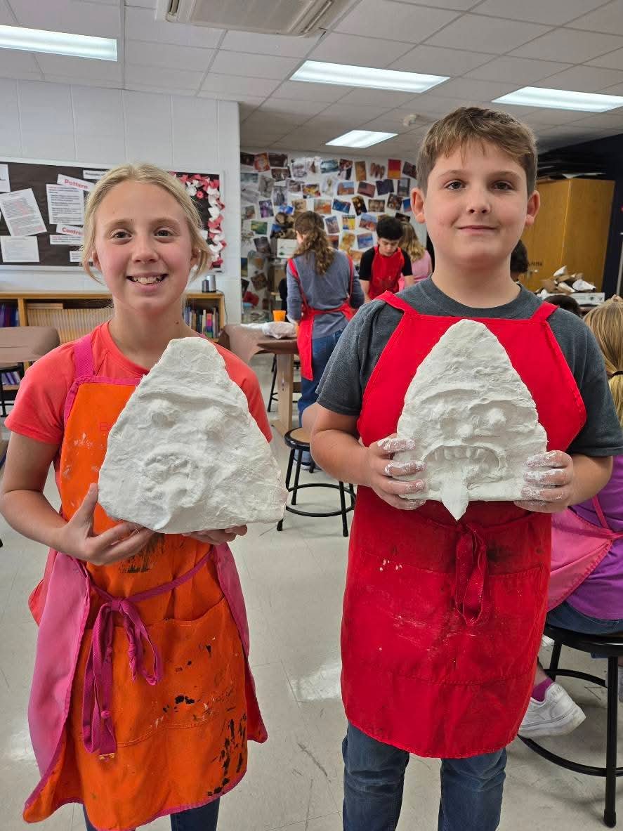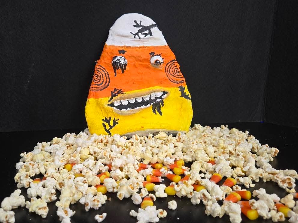 “It’s alive, it’s ALIVE…!” This fall, sixth grade students in Mrs. Weiner’s Visual Art class at Foley Middle School were having a spooktacular time sculpting Candy Corn Monsters with plaster strips. Students started with a cardboard shape they wrapped loosely with newspaper (allowing air inside the paper) and tape to form an armature. After cutting plaster strips to an inch by four inches, students applied two layers to their form. They learned how the wet plaster gauze needed to be worked with quickly and smoothed out before it began to dry to have a clean presentation. Spooky facial features were added by layering and folding the plaster strips. Once dry, the plaster sculptures were painted with acrylics. It was a frightfully great experience. Working with plaster guaze tips: Cut plaster strips beforehand. One inch by four inches is good for structural support and be certain to overlap strips. Cover your tables to help with cleaning up. Each student needs their own cup of water. Lay out small amounts of plaster strips at a time to prevent unused strips from getting wet (accidently wetting the strips activates the plaster and are practically unusable once that happens). Do NOT pour plaster water down your drains (save your pipes from clogging), it is best to empty the water in a bucket and wipe the plaster residue from the cups into the bucket. Dispose safely outside. Save your hands and your cuticles! Helping each student and cleaning out water cups is rough on your hands. Be aware that the plaster wants to harden and dry your skin. Apply some Aquaphor, vaseline, or lotion beforehand as a barrier and afterwards. Help your wet forms dry by using a fan after school hours (do not use fans with people in the room). Trivia: Mary Shelley’s Dr. Frankenstein never said “It’s alive, it’s alive.” The famous quote comes from the 1931 Frankenstein film.