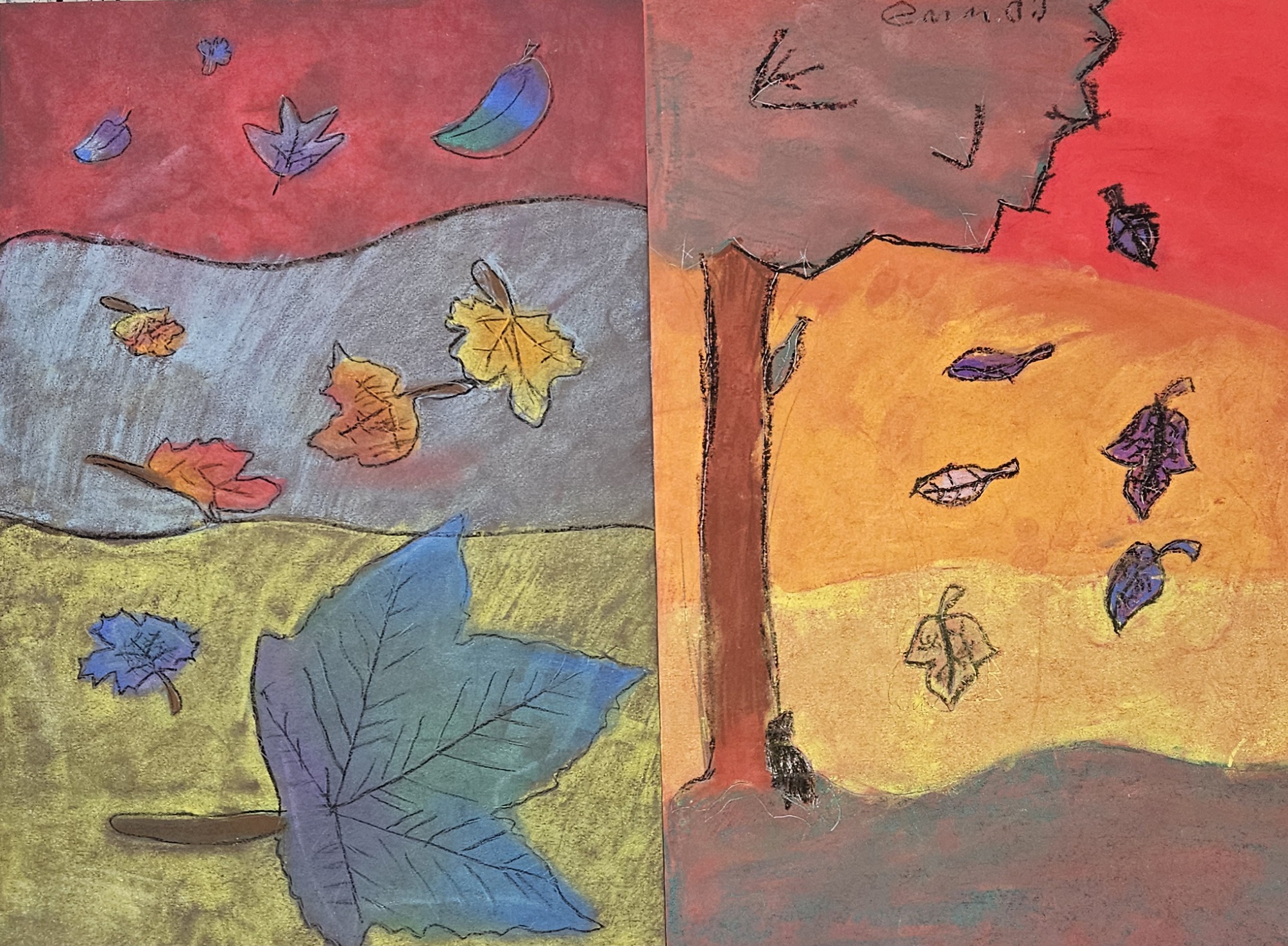 The bold leaves of 4th and 5th graders were created with chalk pastels outlined in black oil pastel with intentional contrasting of warm and cool colors. A sense of space and movement resulted from leaf size, direction and shape. Fourth grade dragon eyes utilized black alcohol based markers and watercolors allowing students to experiment with mixing, blending, and basic watercolor techniques resulting in a wide array of colorful, impactful eyes. Fifth grade dragon eyes dove into oil pastels utilizing layering, blending, and contrast with remarkable results.